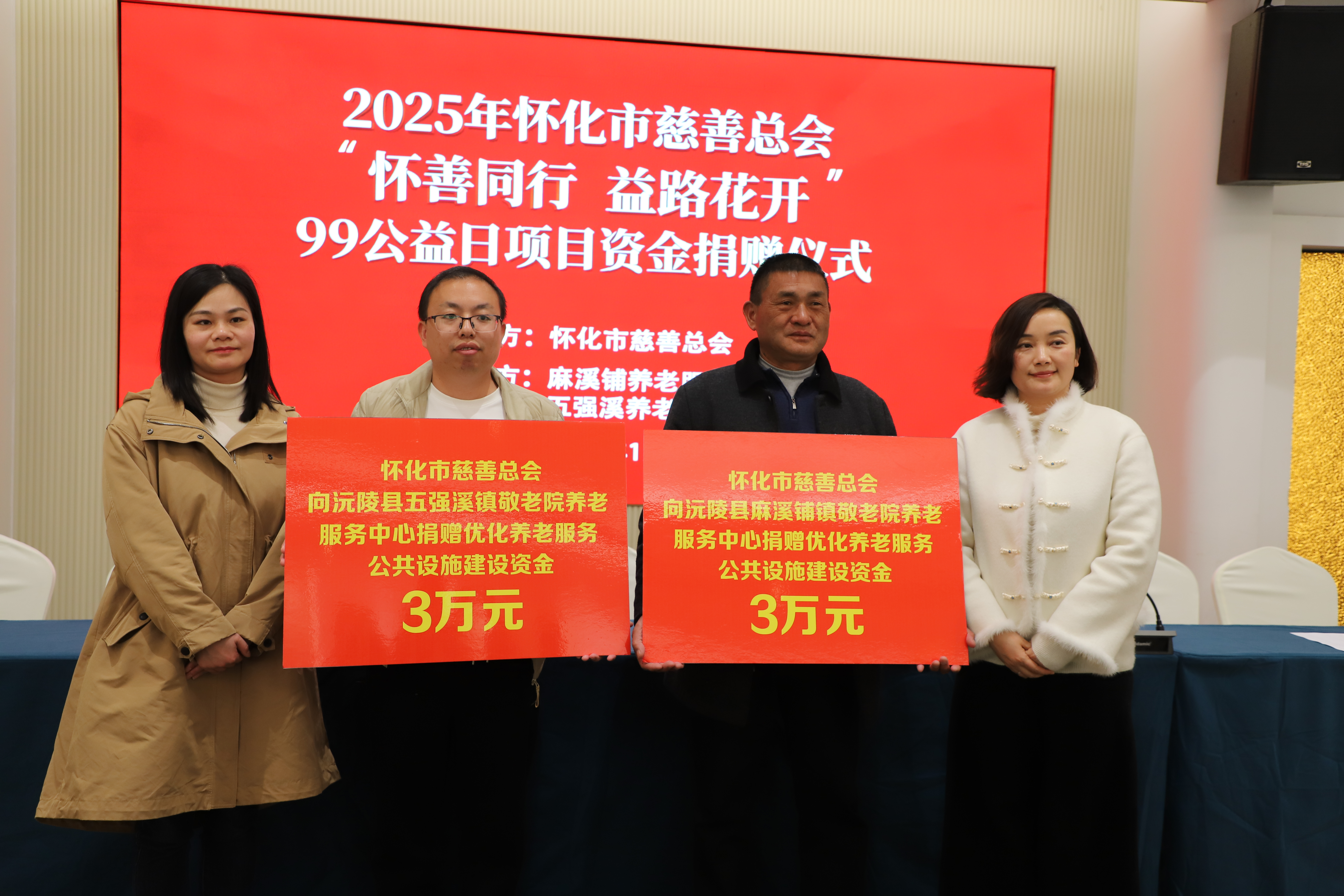 1月12日下午3点,2025年“怀善同行·益路花开”99公益日项目资金捐赠仪式在沅陵县金凤酒店举行。怀化市慈善总会为麻溪铺镇敬老院养老服务中心、五强溪镇敬老院养老服务中心捐赠优化养老服务公共设施建设资金各3万元。