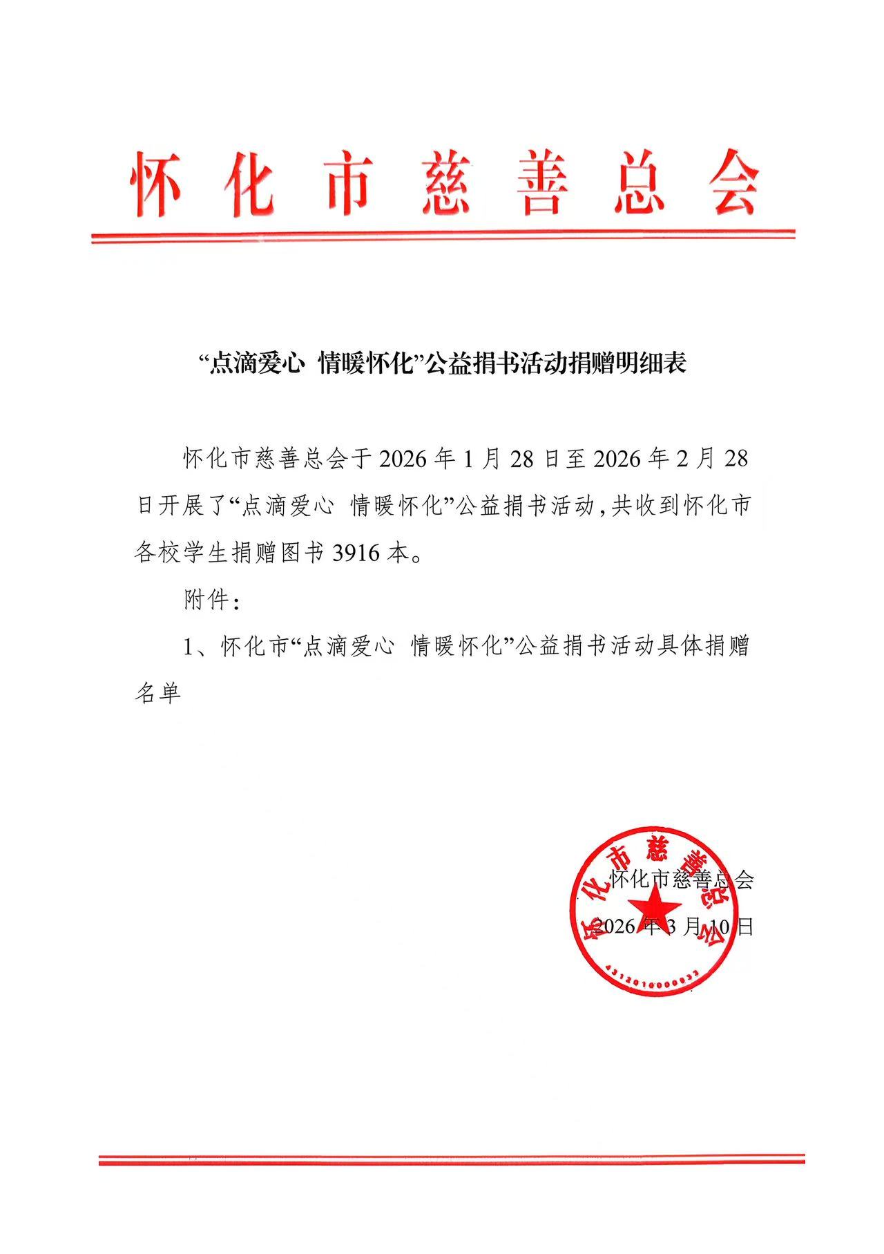 2026“点滴爱心 情暖怀化”公益捐书活动捐赠明细表公示