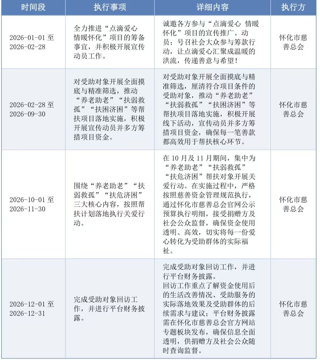 为积极响应国家积极应对人口老龄化、乡村振兴战略部署,紧跟腾讯久久公益“长期深度陪伴、强化行为公益、聚焦数字化建设”最新政策导向,怀化市慈善总会依托“情系失独暖怀计划”、“惠老助餐·小善大爱”、“怀化扬州慈善励志班”等成熟项目沉淀的实践经验,形成了可落地、可复制的公益帮扶路径。同时,为弘扬慈善志愿文化,发挥慈善事业在多层次社会保障体系、社会治理现代化及第三次分配中的关键作用,2026 年久久公益项目紧密围绕“养老助老”“扶弱救孤”“扶困济困”三大核心内容,严格贯彻《中华人民共和国慈善法》及省、市相关工作要求,让公益行动更具合规性与公信力。