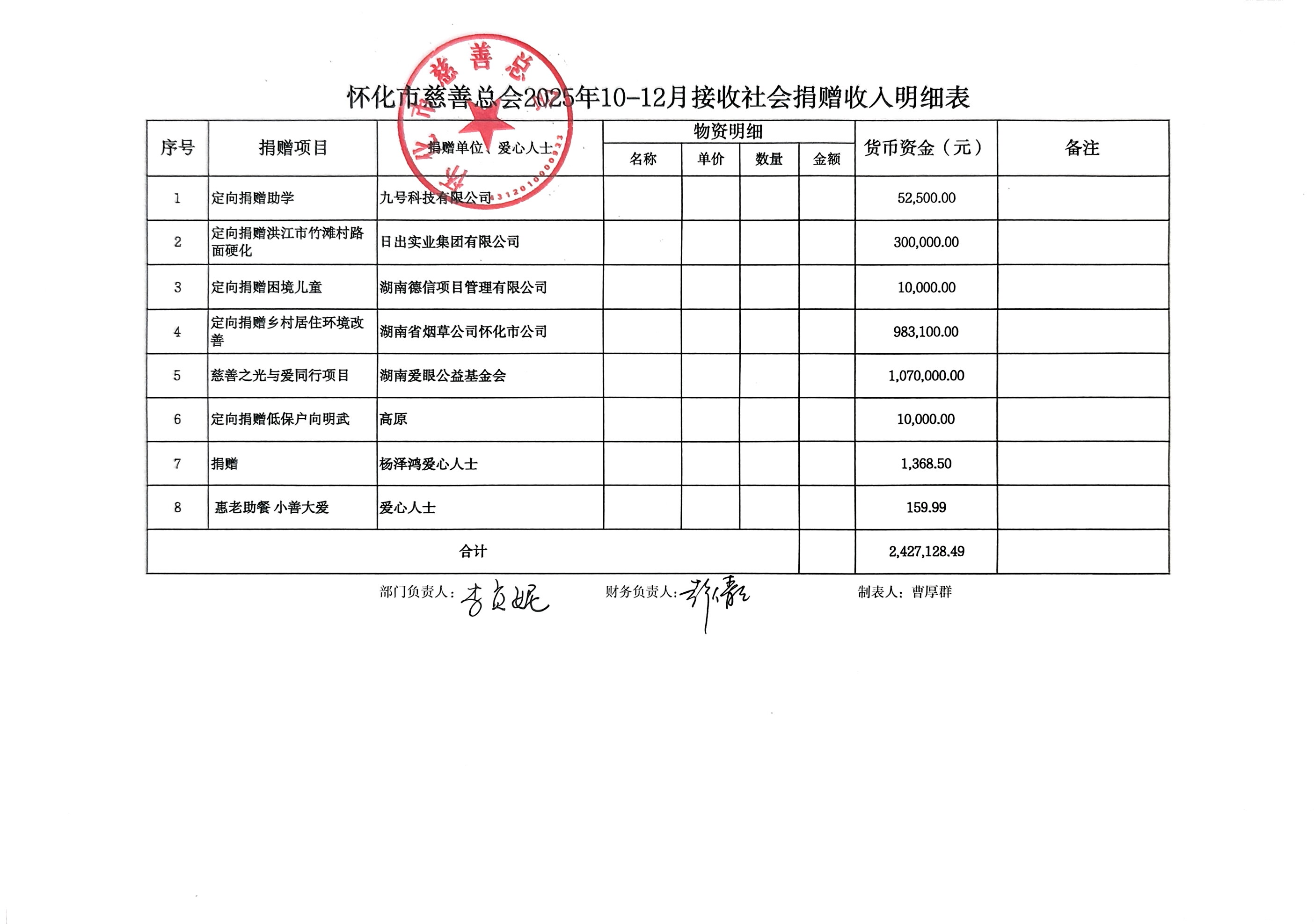 怀化市2025年10-12月接收社会捐赠收入明细表