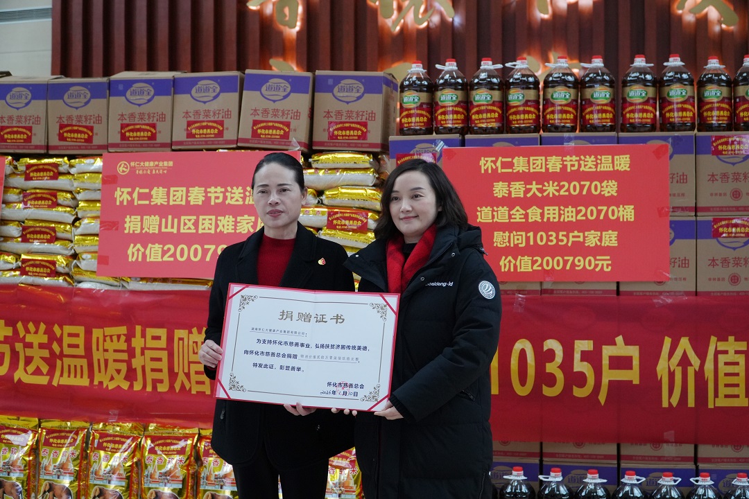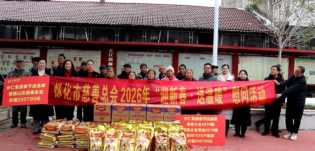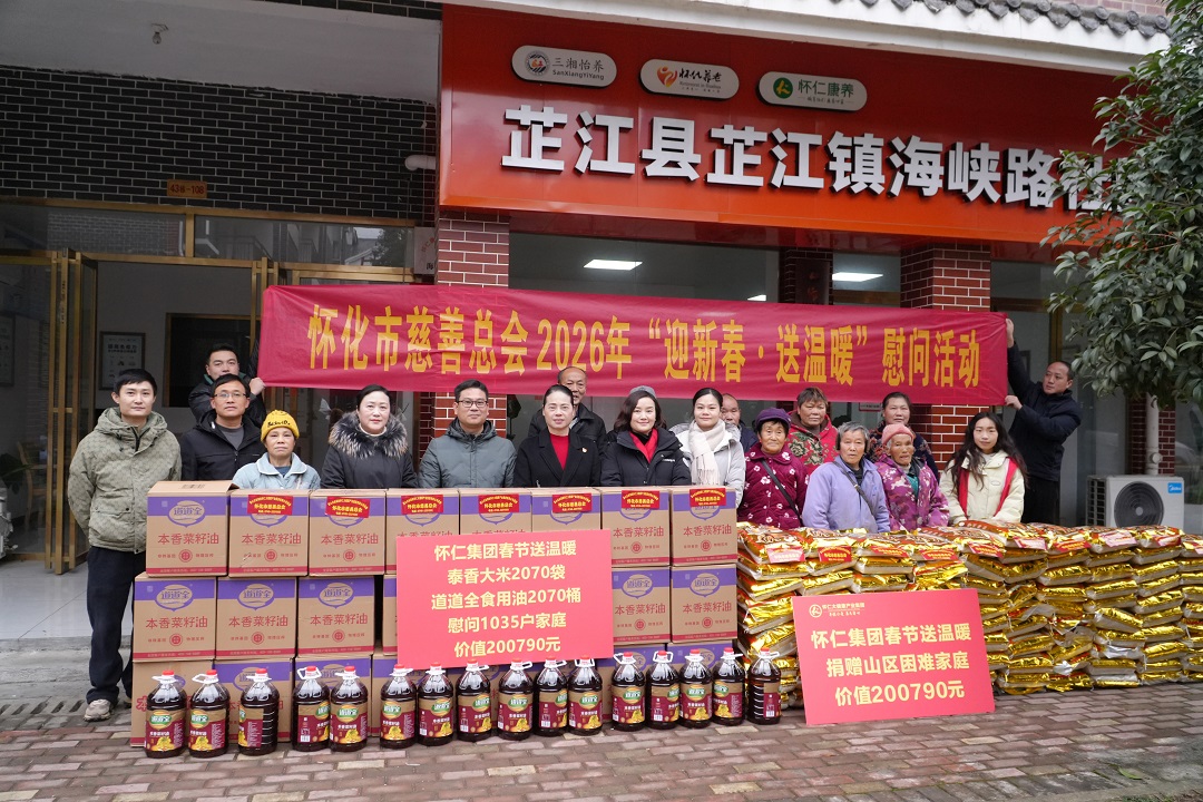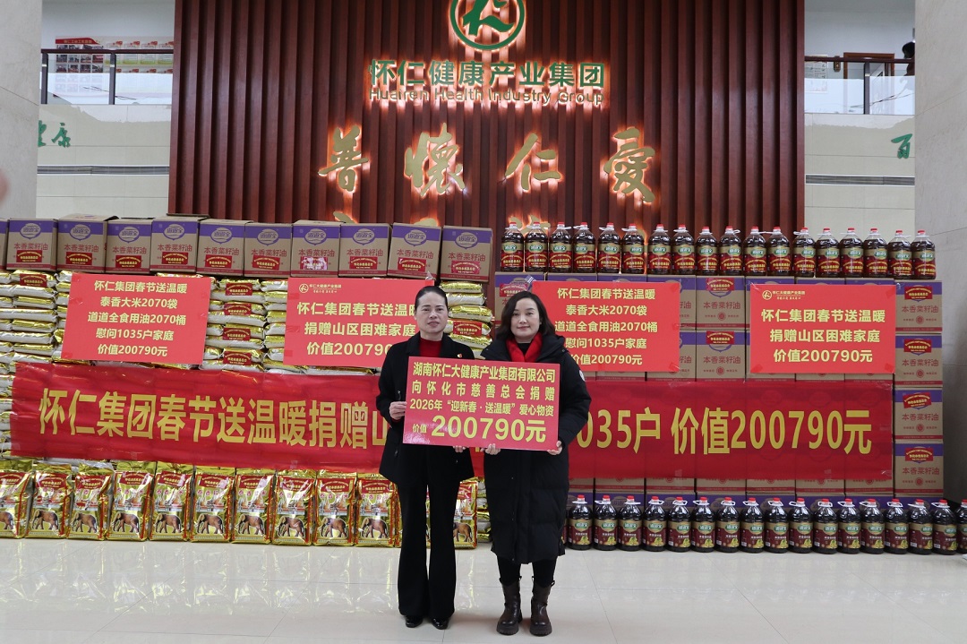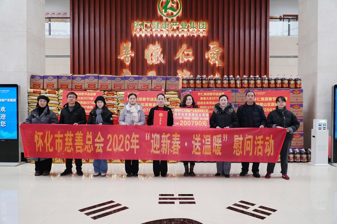 1月30日上午,怀化市慈善总会2026年“迎新春送温暖”慰问活动爱心物资捐赠仪式在湖南怀仁大健康产业集团有限公司顺利举行。市慈救中心主任、市慈善总会办公室负责人李贞妮,怀化市慈善总会副会长、怀仁大健康产业集团有限公司党委书记、副董事长陈毳萍,芷江县慈善会、通道县慈善会及部分受助群众代表等共同参加捐赠仪式。