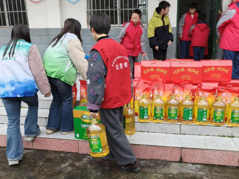 县民政局机关支部负责人发表讲话,向全校师生送上新春的美好祝愿,表达了对特殊儿童群体的深切关怀。紧接着,现场举行了简朴而温暖的捐赠仪式,爱心单位为孩子们送上了精心准备的慰问物资,包括30份爱心礼盒、15桶食用油和15袋大米。每一份物资都承载着社会大家庭的深情厚谊,传递着浓浓的节日祝福。