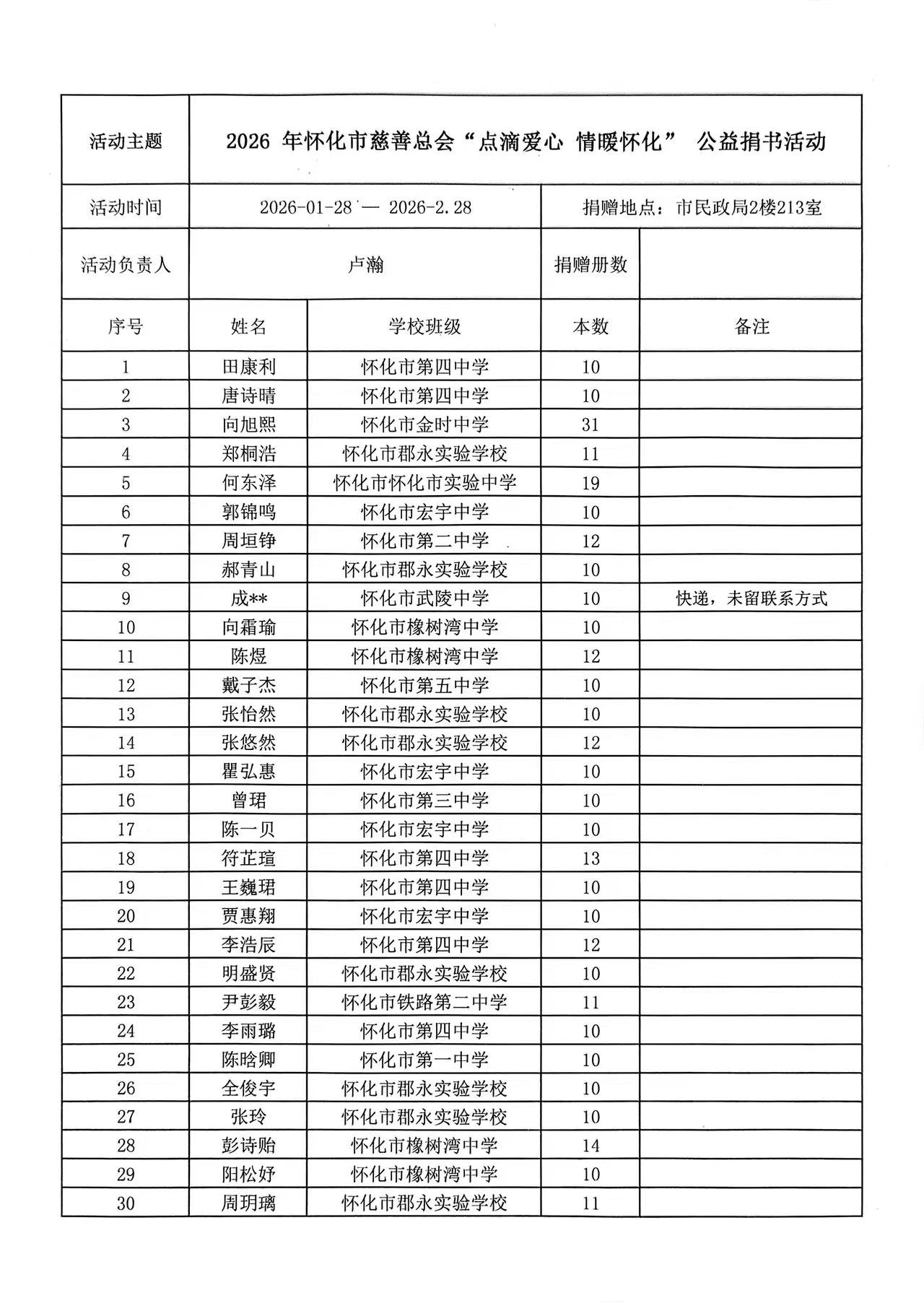 2026“点滴爱心 情暖怀化”公益捐书活动捐赠明细表公示