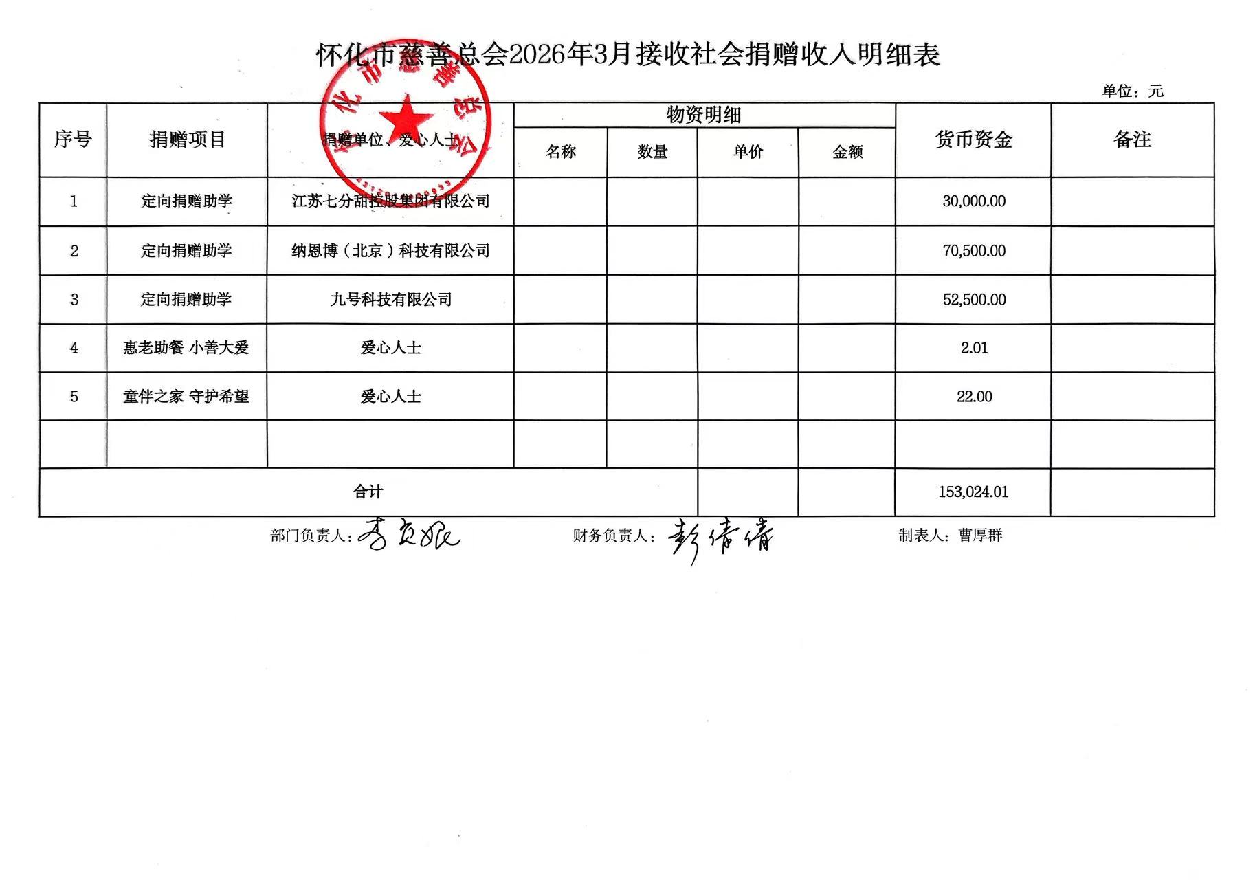 怀化市慈善总会2026年3月接受社会捐赠收入明细表
